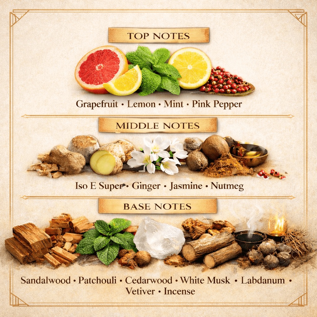 Base Notes: Sandalwood, Patchouli, Cedarwood, White Musk, Labdanum, Vetiver, Incense 🪵🍃🌲🖤🌿🌿🔥