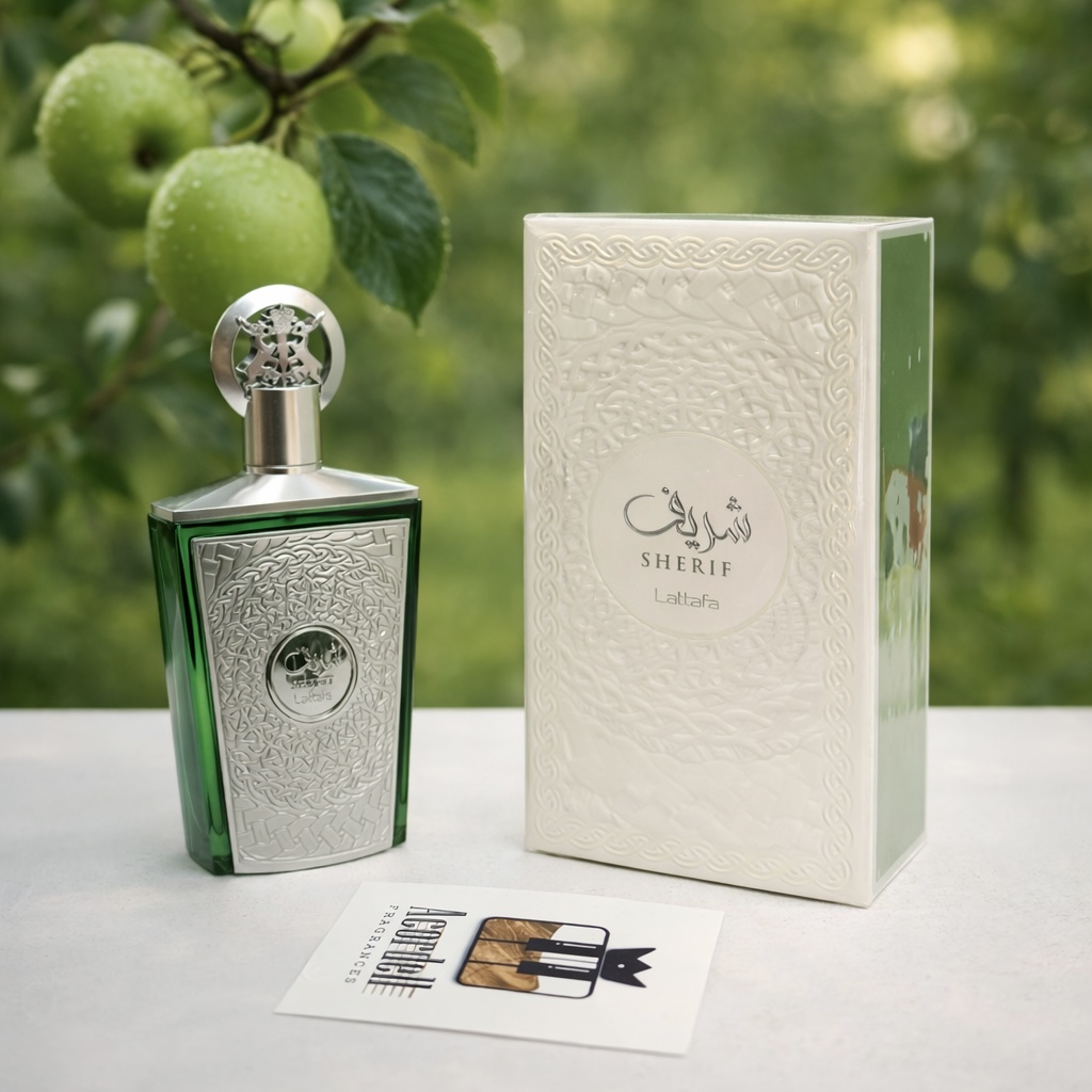 Sherif by Lattafa Perfumes is a refined woody-aromatic fragrance that blends crisp fruit with smooth woods and warm musky depth. It opens with apple layered with petitgrain and bergamot, creating a fresh and slightly green citrus introduction. The heart unfolds into cedarwood and cashmeran enhanced by violet, adding soft woody warmth with a subtle powdery nuance. In the dry down, oakmoss provides earthy texture, while musk and amber create a smooth, warm foundation with lasting refinement. Clean and versatile, Sherif is well suited for daily wear and transitional seasons.