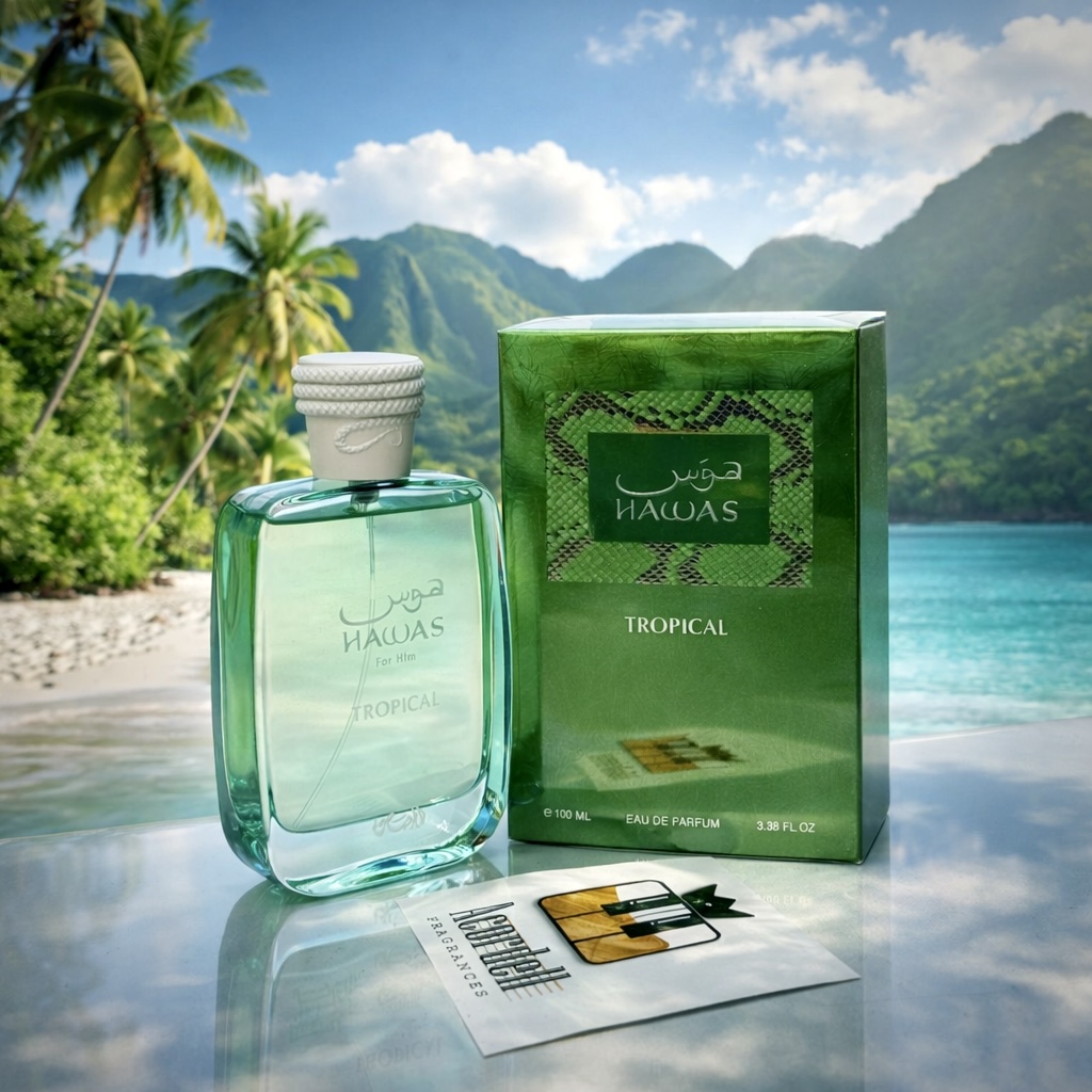 Hawas Tropical by Rasasi is a fresh tropical fragrance that blends creamy coconut with green fig and soft woody warmth. It opens with coconut water and fig leaf enhanced by ginger, creating a refreshing yet slightly spicy introduction. The heart unfolds into coconut layered with fig and mint, adding creamy sweetness balanced by cool aromatic nuance. In the dry down, sandalwood provides smooth woody depth, while tonka bean and musk create a warm, comforting foundation with lasting softness. Relaxed and vibrant, Hawas Tropical is well suited for warm weather and casual wear.